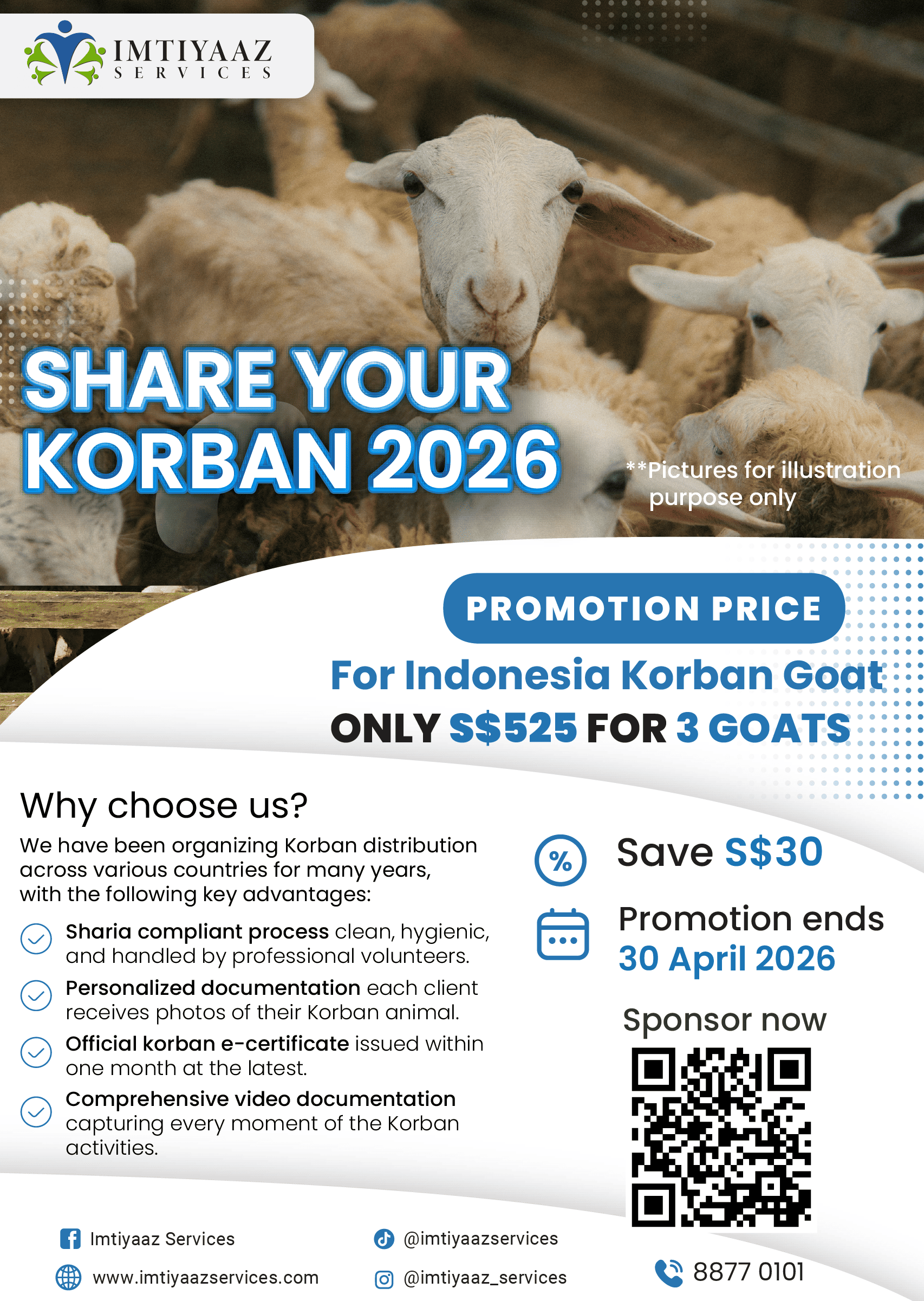 Enjoy our limited promo price for Indonesia goats! Only S$525 for 3 goats, a discount of $30 from its usual price of $555. This is for a limited period only. Let’s share happiness with them, share your korban package to the poor communities in Indonesia. Promotion has been extended while stocks last. Book your goat now!!!